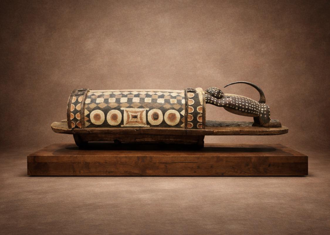 Long de plus de trois mètres et pesant près de 400 kilogrammes, le Djidji Ayôkwé – qui signifie « Panthère-Lion » en langue atchan – était autrefois un instrument central de communication pour les populations du sud de la Côte d’Ivoire. Ce tambour monumental permettait de transmettre des messages sur de longues distances grâce à un système de sons codés.
