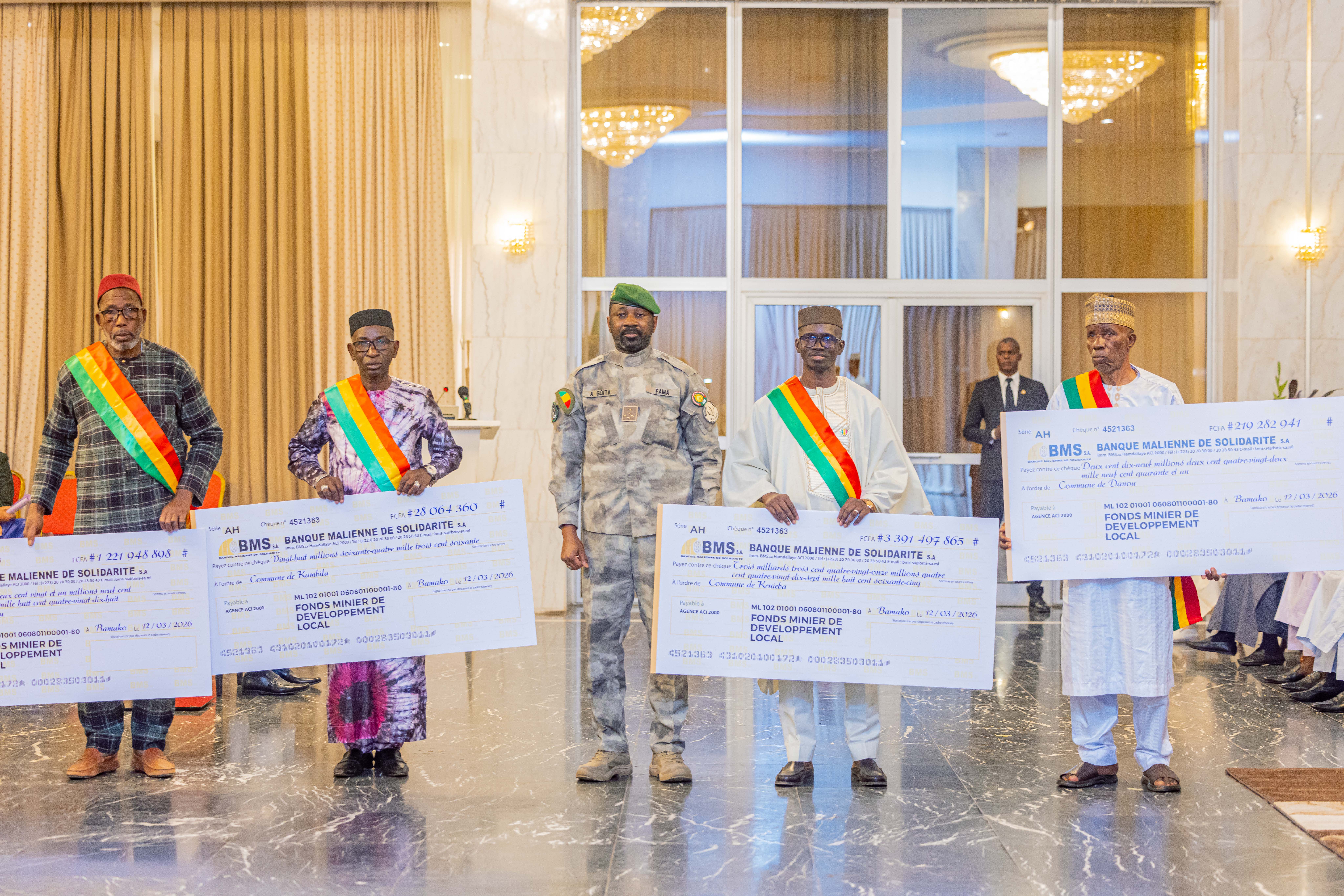 Au palais de Koulouba, les flashes des photographes crépitent tandis que d’imposants chèques symboliques sont brandis devant les caméras. Ce jeudi 12 mars 2026, le président Assimi Goïta préside une cérémonie à forte portée politique : la remise des premiers financements du Fonds minier de développement local à neuf communes du pays. Une initiative qui, selon les autorités, doit marquer une nouvelle étape dans la redistribution des richesses issues de l’exploitation minière.