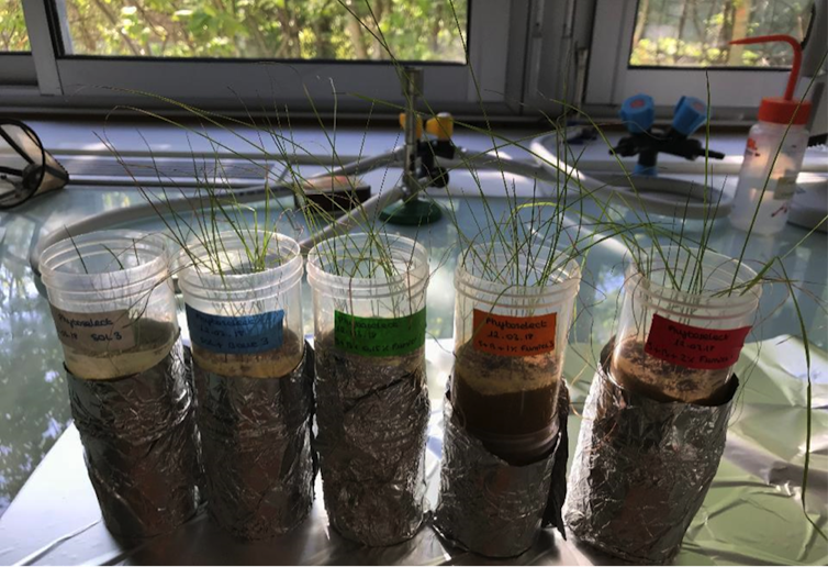 Un résidu sableux et acide, riche en plomb et arsenic, a été prélevé sur le site de l’ancienne mine d’argent de Pontgibaud, dans le Puy-de-Dôme. Des expériences de laboratoire à petite échelle ont tout d’abord permis de choisir les meilleurs ingrédients qui seront mélangés à ce sol toxique et pauvre en nutriments pour permettre aux plantes de pousser et neutraliser les effets de la pollution.