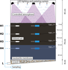 Ce dernier permet ainsi d’étudier, dans les conditions contrôlées du laboratoire, le comportement des polluants sur un profil de dépôt de résidu, de sa surface à la nappe souterraine. Le mésocosme est équipé de l’éclairage nécessaire pour la croissance des plantes et d’un système d’arrosage contrôlé, ainsi que de systèmes de mesure et de prélèvement d’eau à chaque profondeur.