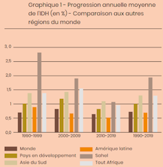 Mesurés par les Nations unies à travers leur Indice de Développement Humain (IDH), les efforts des États sahéliens en faveur du développement sont notables. L’IDH a fortement progressé au Sahel depuis les années 1990 : +1,9 % par an en moyenne, soit trois fois plus qu’à l’échelle mondiale.