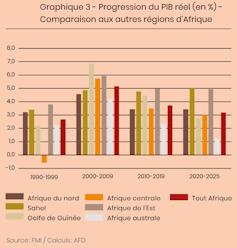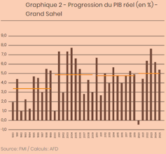 Le PIB sahélien a quadruplé entre 1990 et 2020 et, sur la période récente également, la région affiche un taux de croissance économique parmi les plus élevés d’Afrique (autour de +4,8 % par an en moyenne depuis 2010).